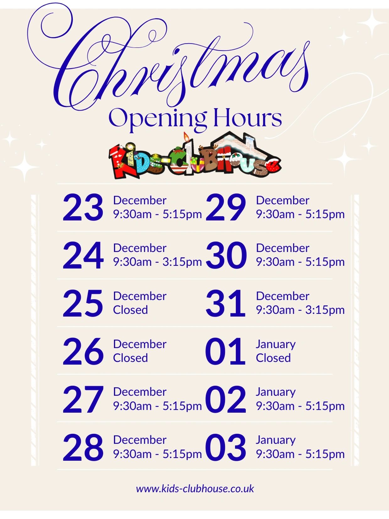 Christmas Eve and New Year's Eve - 9.30am till 3.15pm